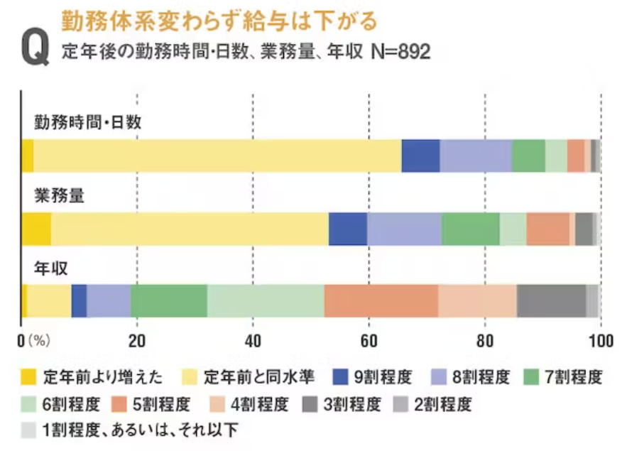 日経ビジネスが2021年に実施したアンケートでは、約半数が業務量は変わらず、給与は6割~4割程度と回答しています。